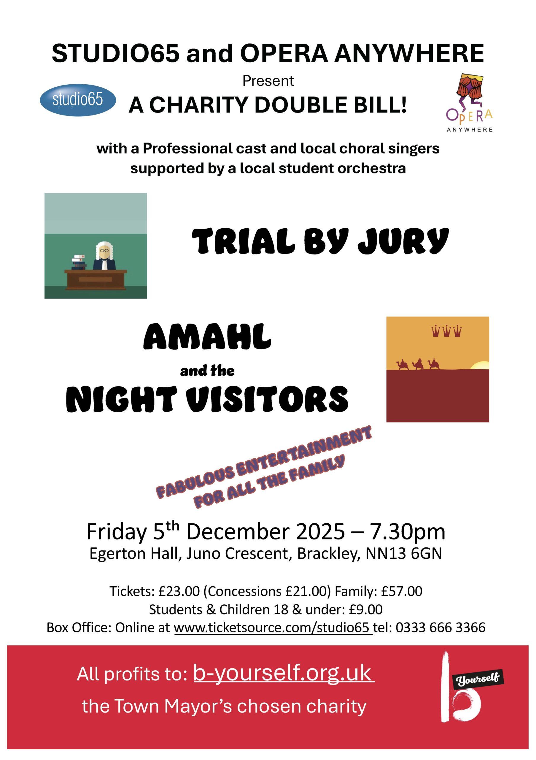 Studio 65 and Opera Anywhere present a charity double bill – Trial by Jury and Amahl and the Night Visitors with a professional cast and local choral singers supported by a local student orchestra. All profits to: b-yourself.org.uk
