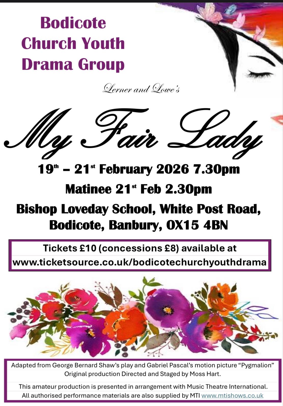 Director of the show, Gill Crowther, said “We can’t wait for you to see this production, the cast have worked so hard, at this challenging and emotional yet fun musical. We have so much talent in our cast and we can’t wait for our audiences to follow Eliza’s story” Bodicote Church Youth Drama Group is one of the longest running local groups and this year marks their 30 th Anniversary. The group is open to members from 8 – 18 who live in the OX15, OX16 or OX17 postcodes and currently has a waiting list for new members.