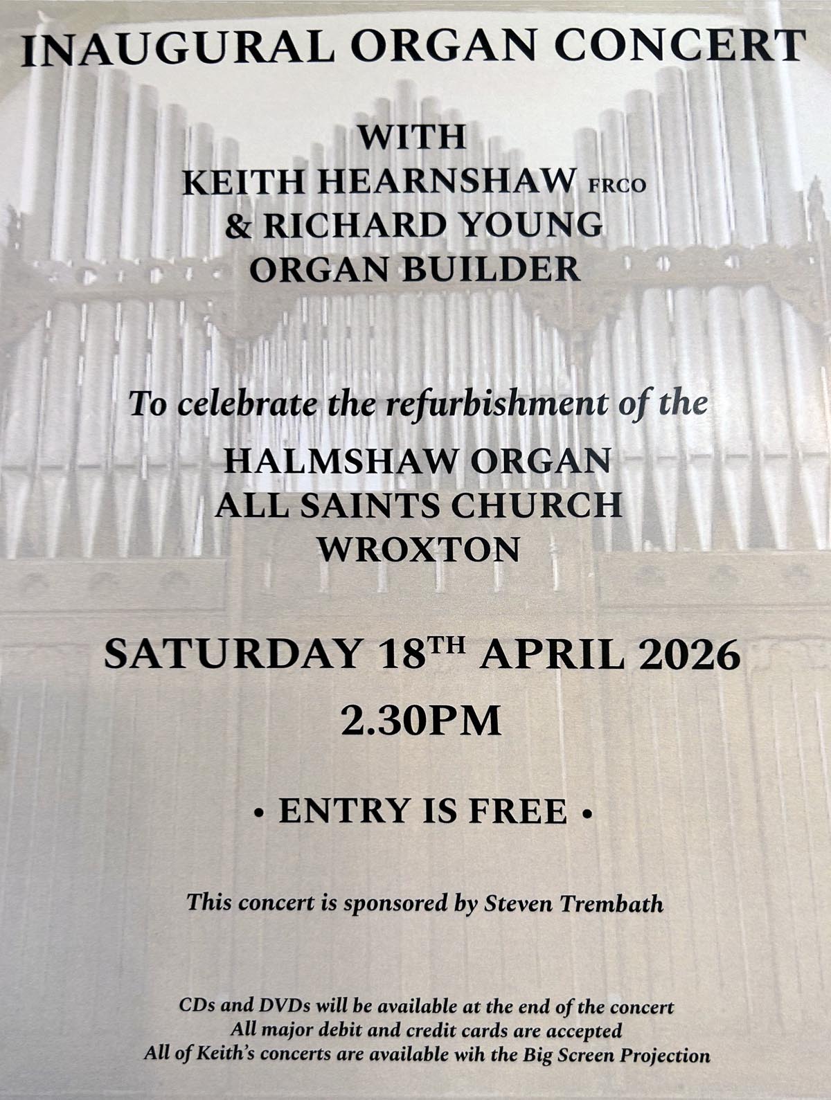A special concert is set to take place at All Saints Church, Wroxton to celebrate the completion of a major refurbishment of its historic Halmshaw organ.