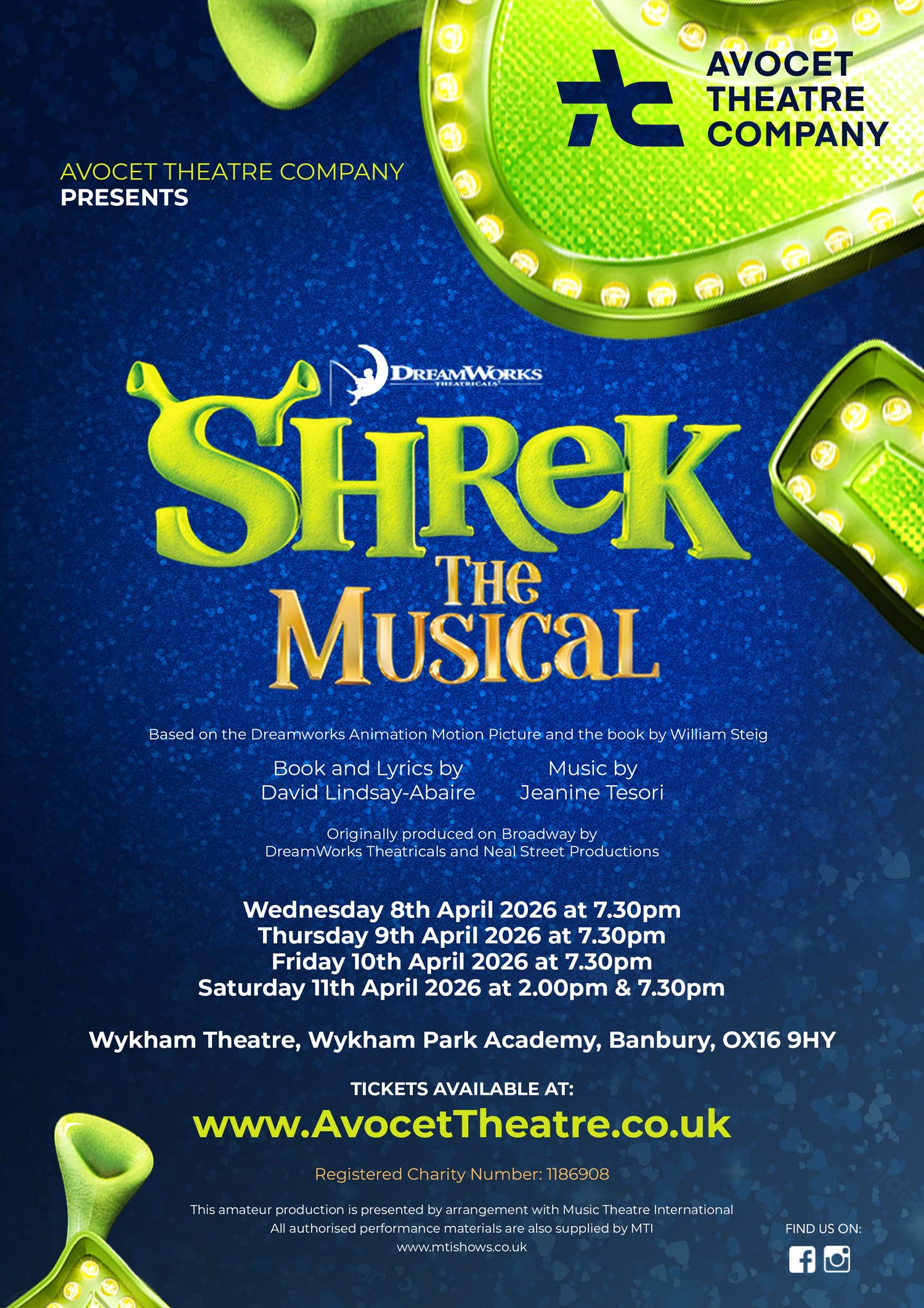 Shrek the Musical runs from Wednesday 8th to Saturday 11th April 2026 at Wykham Theatre, Wykham Park Academy, Banbury. Evening performances begin at 7.30pm, with a Saturday matinee at 2.00pm. Tickets are available now at www.AvocetTheatre.co.uk/tickets, but audiences are advised to book quickly as performances are already filling fast and availability is limited.