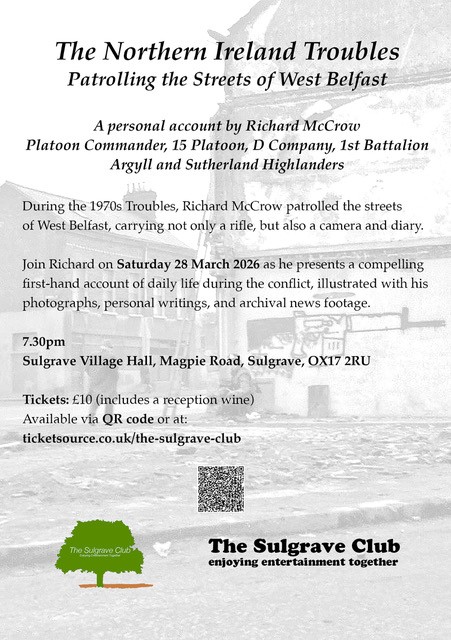 The Sulgrave Club’s first speaker evening of the year features Sulgrave resident Richard McCrow, who will present a powerful first-hand account of patrolling the streets of West Belfast during the Northern Ireland Troubles 50 years ago.