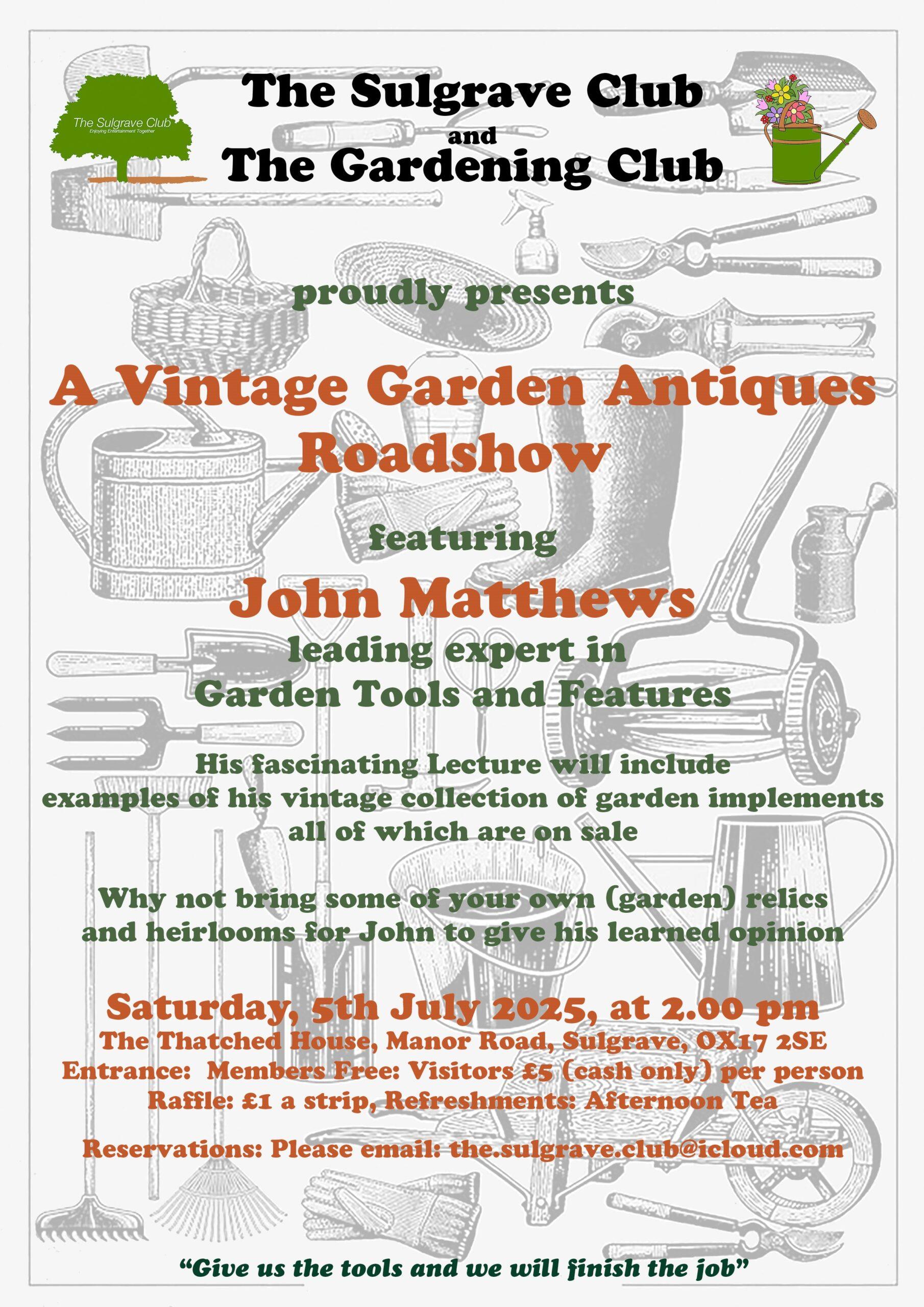 John Matthew, the leading expert in the history of gardening equipment, will be presenting his Vintage Garden Antiques Roadshow on Saturday, 5th July 2025, at 2.00 pm, at the Thatched House, Manor Road, Sulgrave, OX17 2SE, near Banbury.