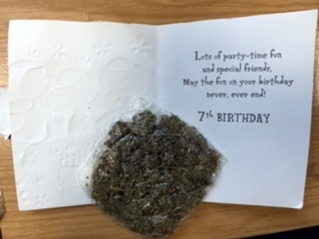 The package appears to be a 7th birthday card with a large amount of cannabis inside.