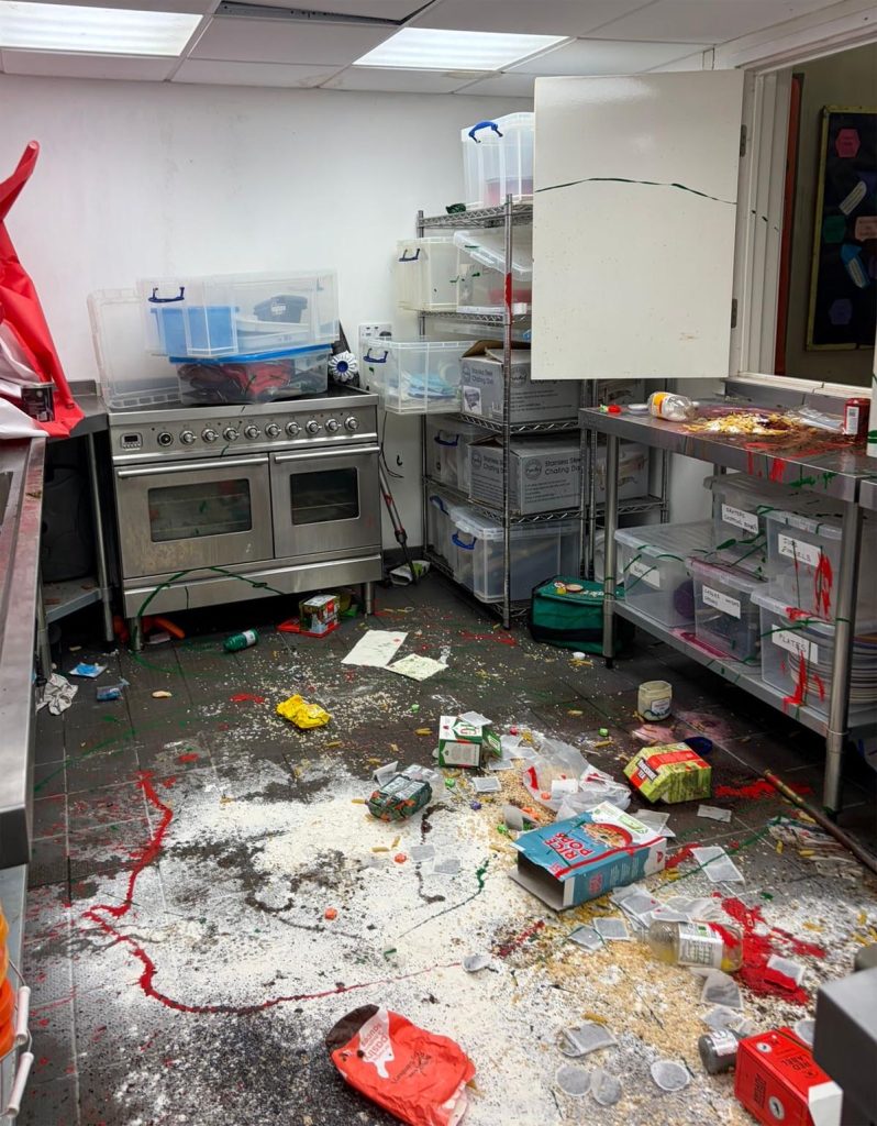 Group Leader Volunteer, Helen Barnby-Porrit, described the scene that greeted them.   “It was just mindless acts of vandalism,” she said.  “There were first aid kits, toilet rolls, all sorts thrown all over the floor.   Things were stuffed down the toilets.   A lot of food was creatively decorating our kitchen.